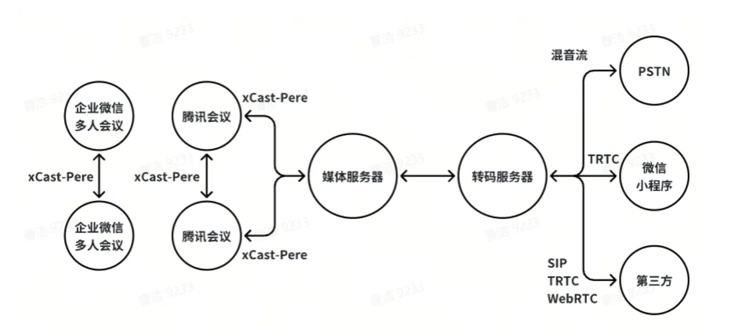 在附文“腾讯会议如何构建实时视频传输算法架构”腾讯强调自 QQ 时代起,在音视频实时传输系统的搭建与优化方面已有多年积累,并重新编写了一个跨平台而且高效的引擎-xCast,引擎之间以 Pere 作为网络层传输协议。结合附文“TRTC 实践,音视频互动 Demo、即时通信 IM 服务搭建”。xCast-Pere 的架构目前仅在腾讯会议生态间支持传输与解析,当数据到达媒体服务器后会在转码服务器里转换为 SIP、TencentRTC 或 WebRTC 进行传输。