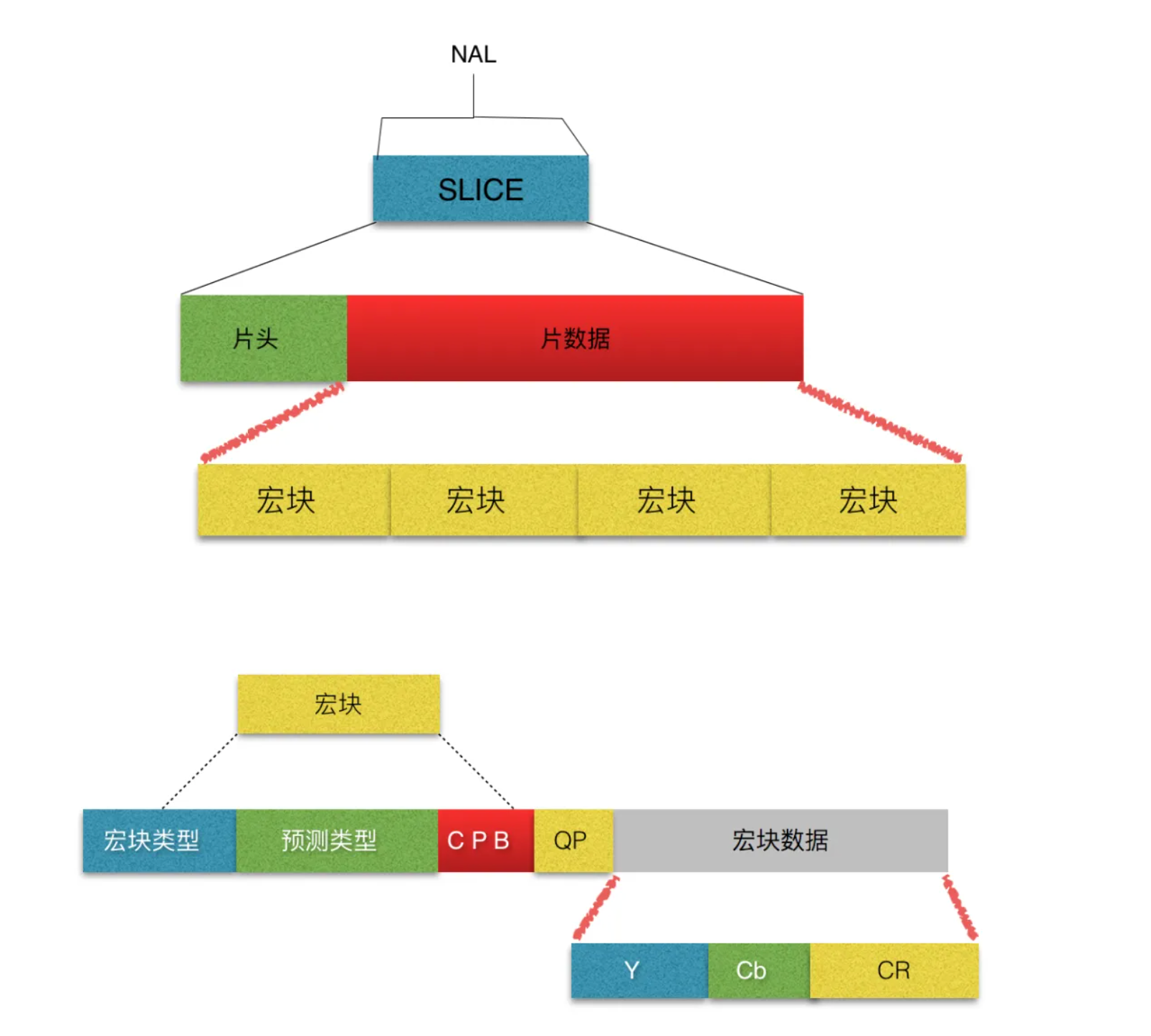 一帧图片经过 H.264 编码器之后,会被编码为一个或多个切片(Slice)。而 NALU(Network Abstraction Layer Unit,网络抽象层单元)则是这些切片的载体。切片的存在主要是为了限制误码的扩散和传输。切片头中包含着诸多重要信息,如切片类型、切片中的宏块类型、切片帧的数量、切片所属的图像以及对应的帧的设置和参数等。切片体所包含的数据则是宏块。宏块作为视频信息的主要承载者,除了含有宏块类型、预测类型、编码块模式和量化参数之外,还包含着每一个像素的亮度分量(Y)以及色度信息(蓝色色度分量 Cb、红色色度分量 Cr)。视频解码的主要工作就在于提供高效的方式,从码流中获取宏块中的像素阵列,从而实现视频的播放和显示。