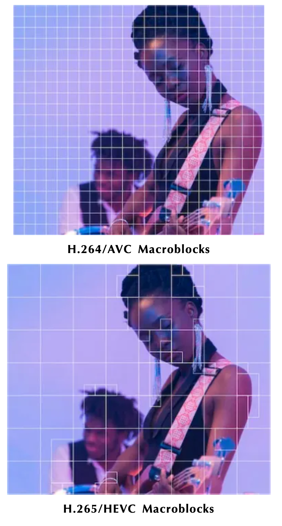 2013 年 H.265/HEVC 被批准为国际标准,与 H.264/AVC 相比,它采用分层四叉树的优化宏块分割算法。前者是16×16 固定像素的宏块,后者是 4×4 到 64×64 动态像素的宏块。因此能更好的支持包括 8K UHD(7680 × 4320)的高分辨率资源的存储与传输。