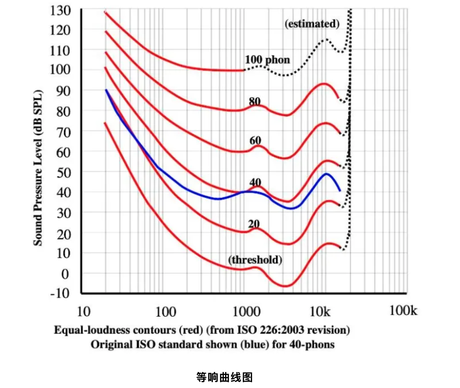 衡量声音的大小往往会用到“音量 Volume”和“响度 Loudness”,分贝(dB/dBSPL)不能像赫兹、克、米那样给出一个客观的量,而只能给出两个相同物理量的比值,所以是一种相对的概念。人耳对不同频率的“响度”感受存在差异,如下图的“等响曲线”图。其中 phon 是响度级的单位,规定在 1000Hz 时,1dBSPL=1phon。在 40phon 以上的区域,当声压提高十倍时,人类的听觉感知只会提高两倍。为了让响度和听觉感知尽量呈线性关系,需要引入另一个响度单位 sone,40phon 等同于 1sone。